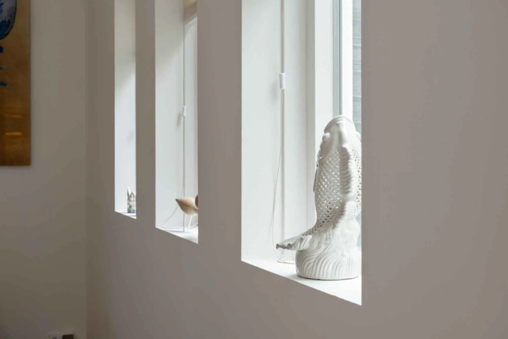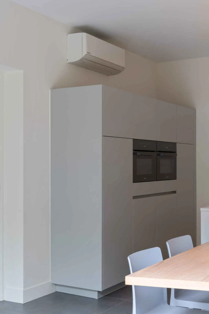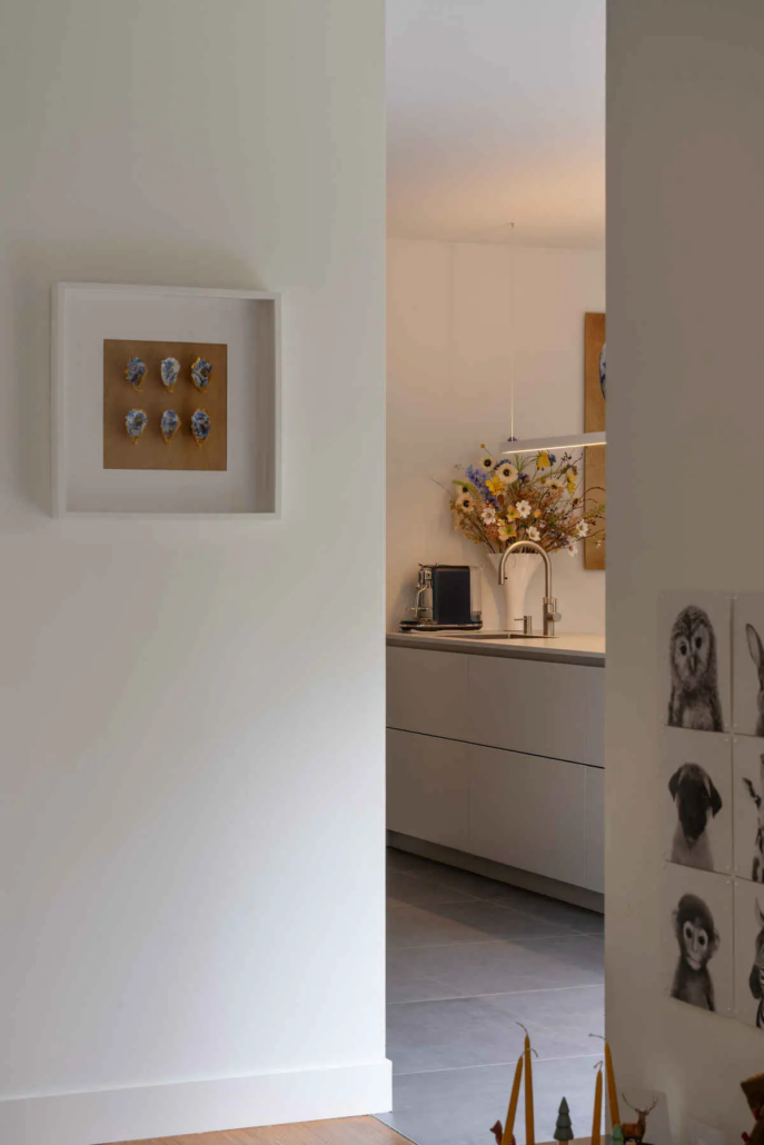 “De keuken is heel lichtgrijs: een koele, rustige kleur. We hebben er ijsblauwe stoeltjes bij en dat past prachtig. Het is heel neutraal en tijdloos en dat is precies wat we wilden. Dat hebben we expres gedaan omdat je de ruimte dan met kleurrijke accessoires persoonlijk kunt maken. Zo hopen we dat we de keuken ook op de lange termijn nog mooi vinden.”