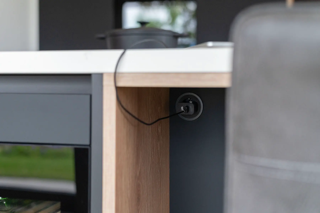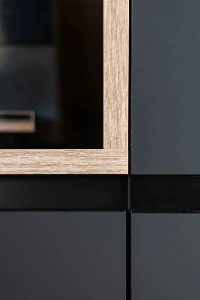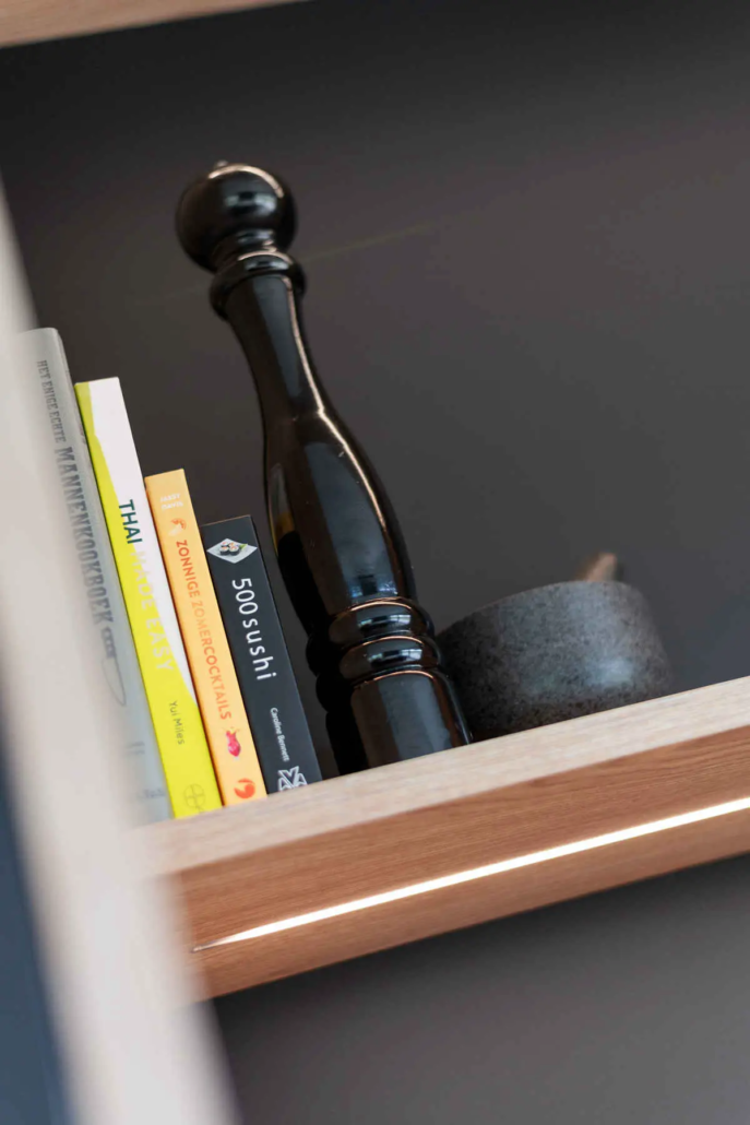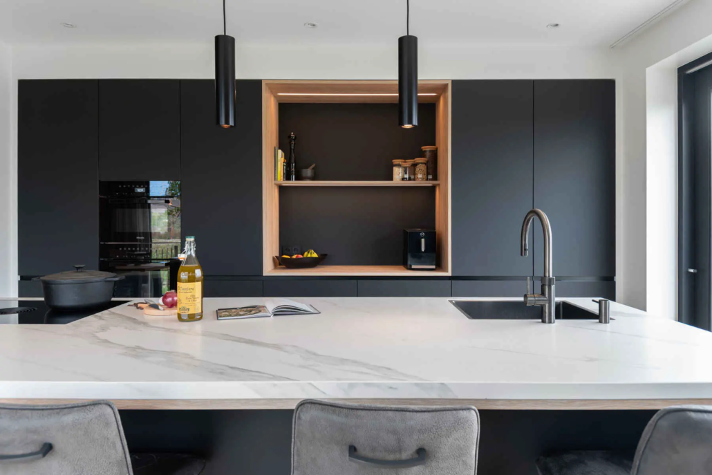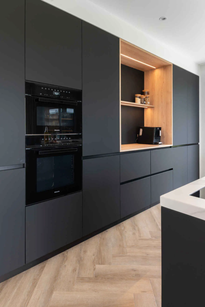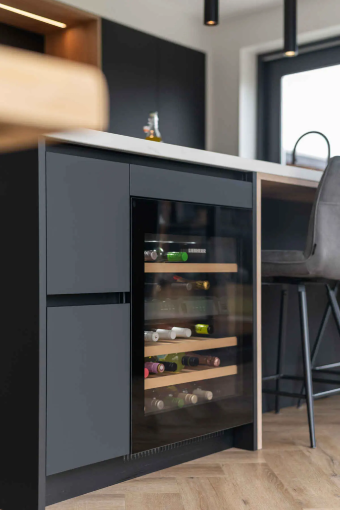 Qua uitstraling bleef het ontwerp dicht bij hun vorige keuken. “De frontjes en het werkblad zijn exact hetzelfde gebleven, alleen hebben we de indeling praktischer gemaakt. We hebben nog wel getwijfeld over een andere kleur, zoals antraciet, maar toen we dat zagen wisten we allebei meteen dat zwart beter zou zijn. Om het geheel wat warmer te maken, hebben we rondom houten accenten toegevoegd in de nis. Ik vond het leuk om het hout ook door te trekken bij de bar. Zo sluit het mooi aan bij de vloer en vormt het één geheel.”