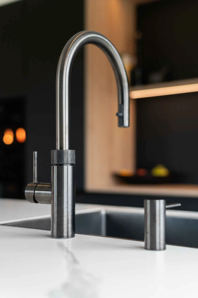 In de nieuwe zwarte keuken werden verschillende praktische details aangepast. “We hebben nu de kookplaat aan de kant van de woonkamer en de kraan juist aan de andere kant”, legt Ilja uit. “Op die manier hangen de handdoekjes niet in het zicht en oogt het een stuk rustiger. Ook hadden we eerst alleen een combimagnetron, maar nu ook een aparte stoomoven. Met een kleine in huis is het handig dat je dingen tegelijk kunt bereiden. Dat soort keuzes maakt het dagelijkse gebruik van de keuken veel fijner.”