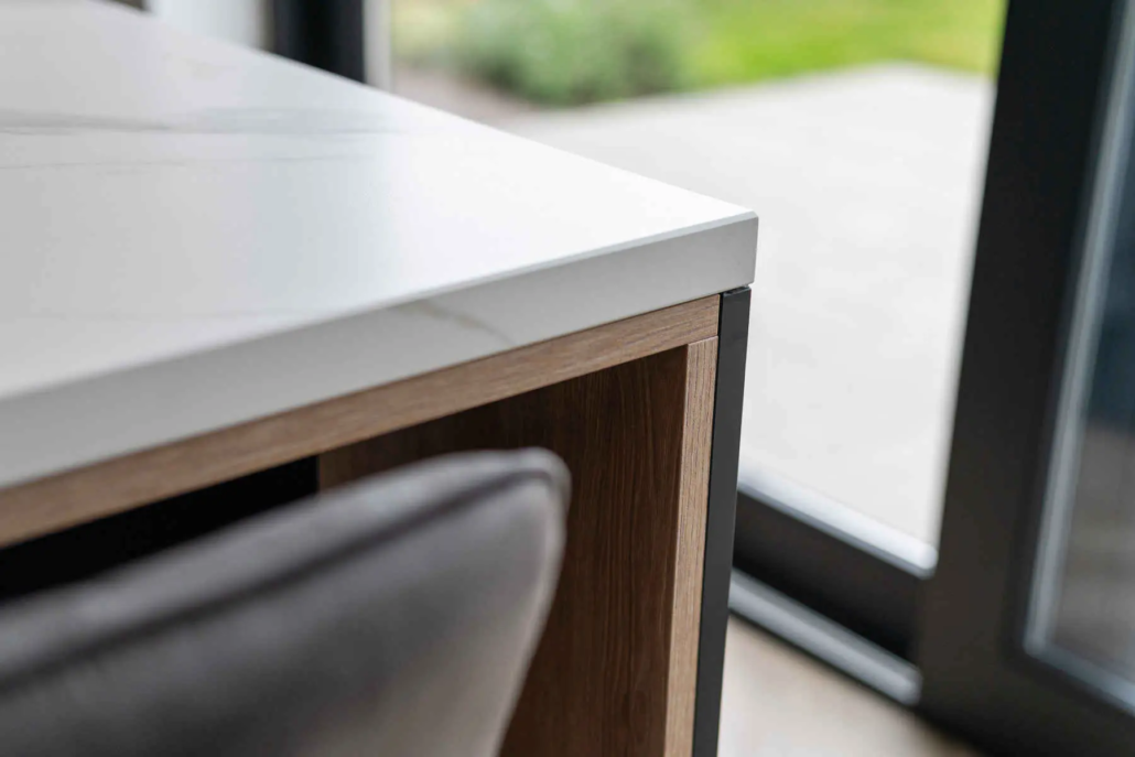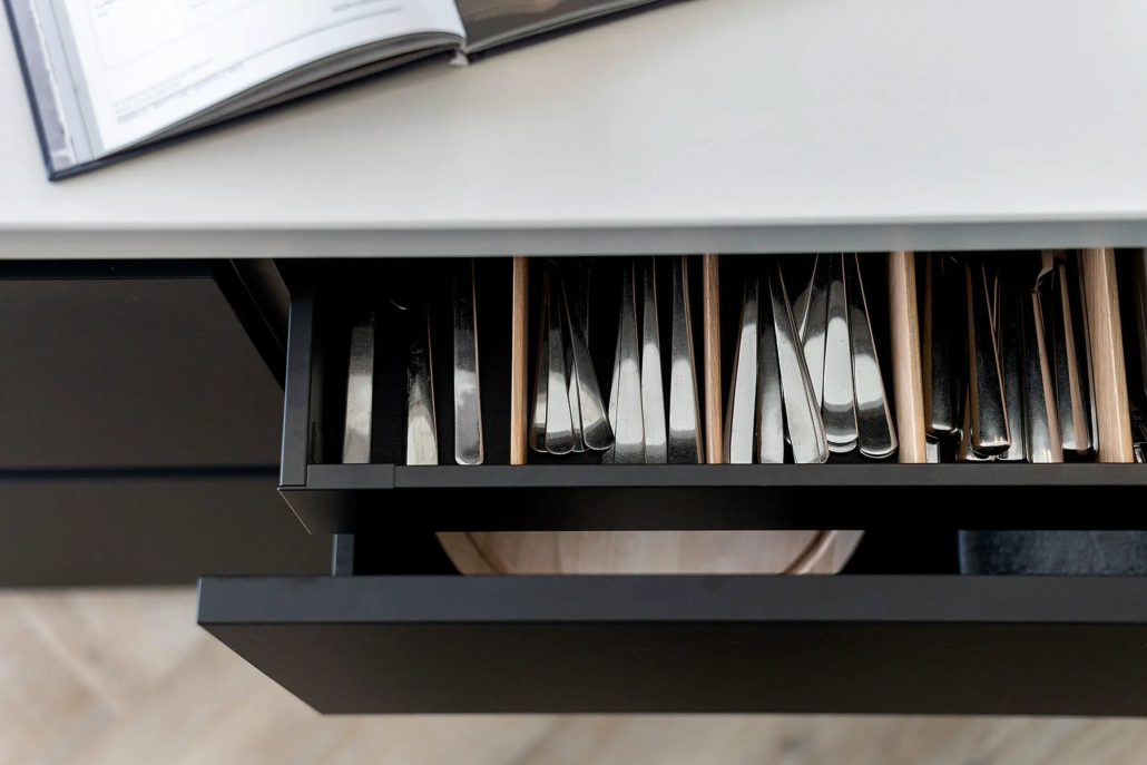“Dit is natuurlijk de eerste keuken in ons nieuwbouwhuis, maar al de tweede keer dat we een keuken bij De Keukenkamer hebben uitgezocht”, vertelt Ilja, “en voor Mario is het zelfs al de derde keer. De keuken die we in ons vorige huis hadden was eigenlijk al bijna perfect, maar we kwamen erachter dat sommige praktische details beter konden. Die verbeteringen hebben we nu allemaal meegenomen.”